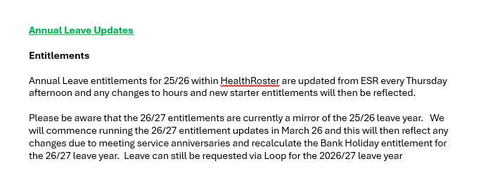 HealthRoster needs to be updated for my hours and / or posting changes and annual leave entitlement